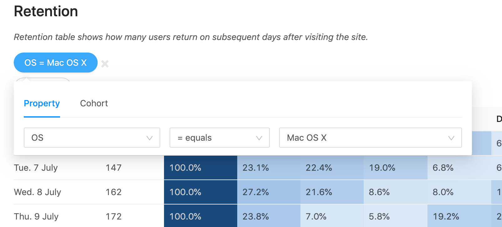We added retention the retention table last week but we're not done with it yet. This week Kacppian, a fervent contributor, added filtering, which combined with the cohort filtering is very powerful.