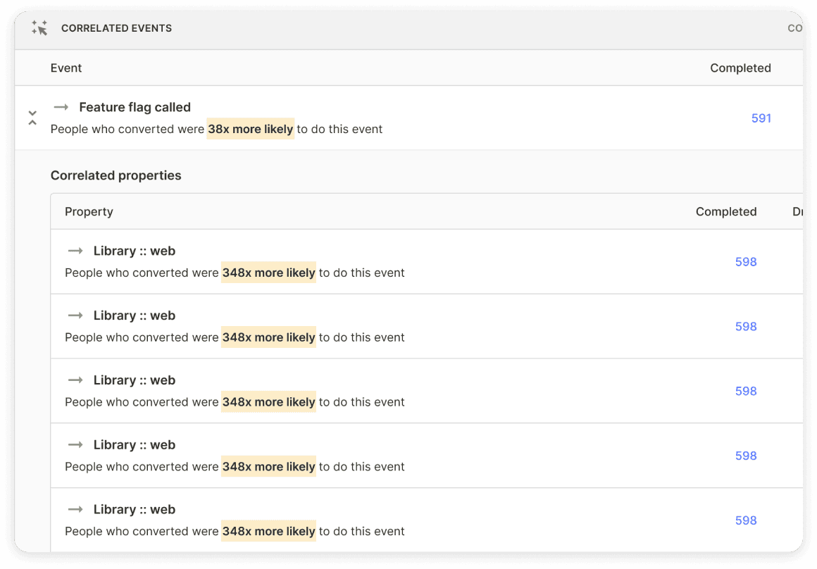 Correlation Analysis automatically suggests which events or user properties lead to success or failure using transparent, testable, statistical models.