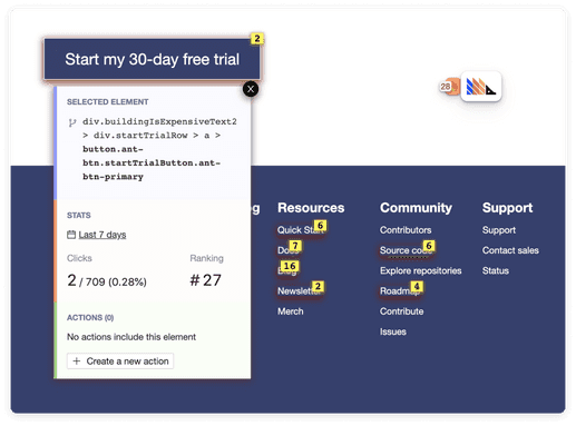 See what’s clicking with users. Heatmaps show what captures users’ attention by overlaying click-counts in your product.
