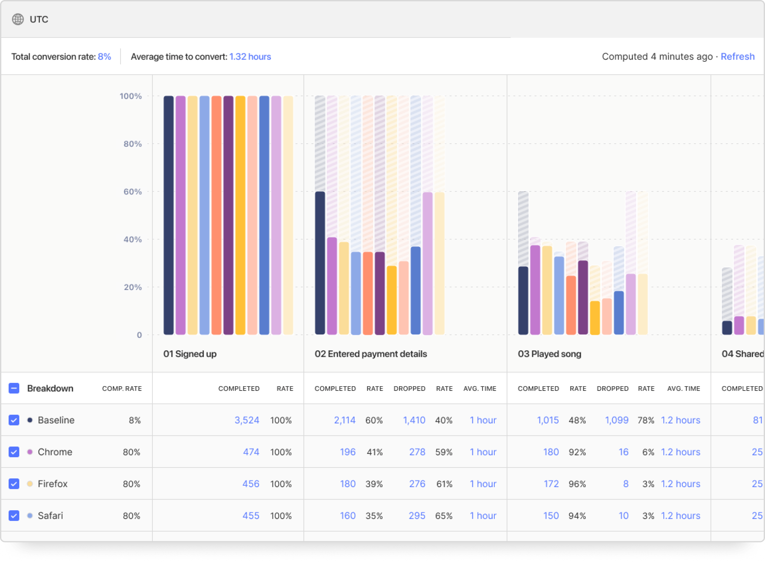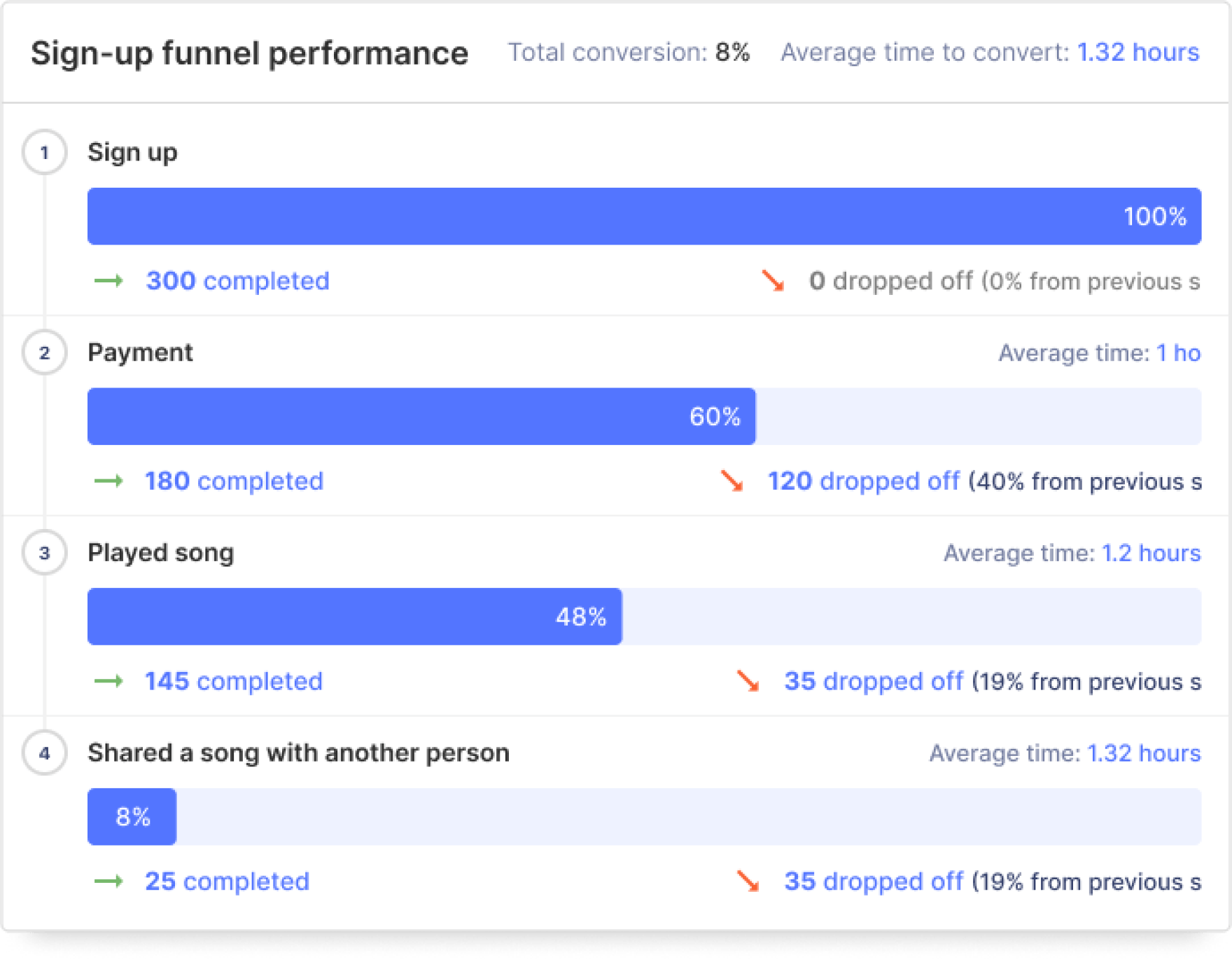 Analyze users across a series of actions. See how many people start or finish a sequence — and where they drop off.