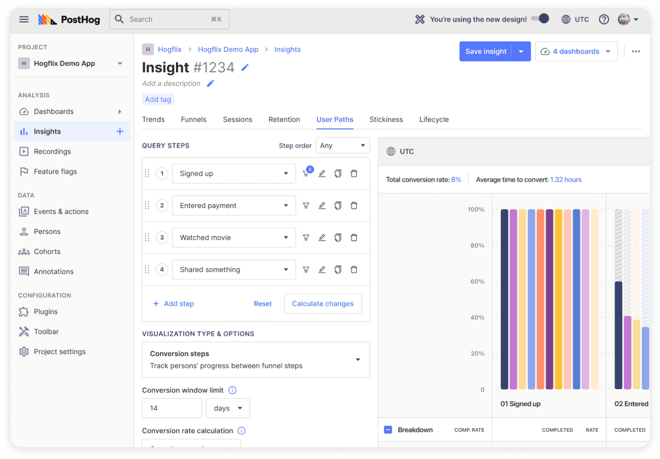 Define any clicks or pageviews retroactively and see historical data since you installed PostHog.
